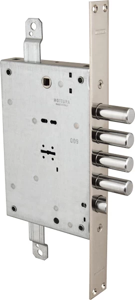 Замок врезной , с тремя точками запирания и защёлкой диаметром 20мм, приводимой в действие ключом и фалевой ручкой сечением квадрата 8мм. Удаление ключевого отверстия и ручки 60мм. Круглые ригеля диаметром 18мм. Ход тяг 19мм.